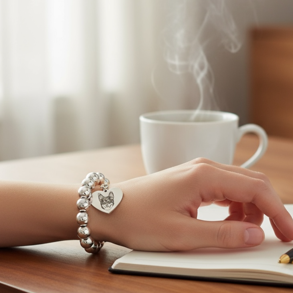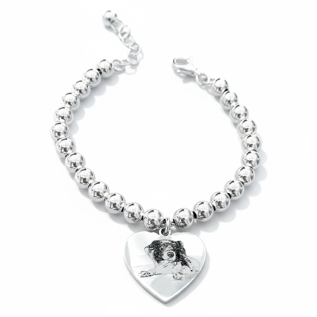 Realizzato con sfere da 10 mm o da 6 mm in argento 925 e chiusura a moschettone, questo bracciale è arricchito da un ciondolo a cuore inciso con il ritratto del tuo cane o gatto, per un tocco unico e affettuoso.